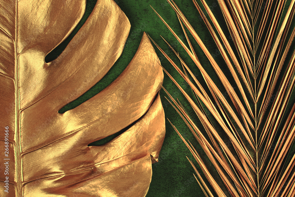 Closeup of golden palm and monstera leaves on abstract dark green textured background. Tropical conceptual elegant trendy summer background. Flat lay. Copy space.
