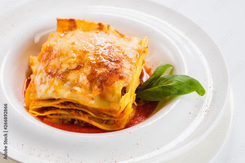 Lasagna "Bolognese" on a white plate on a light background (close)