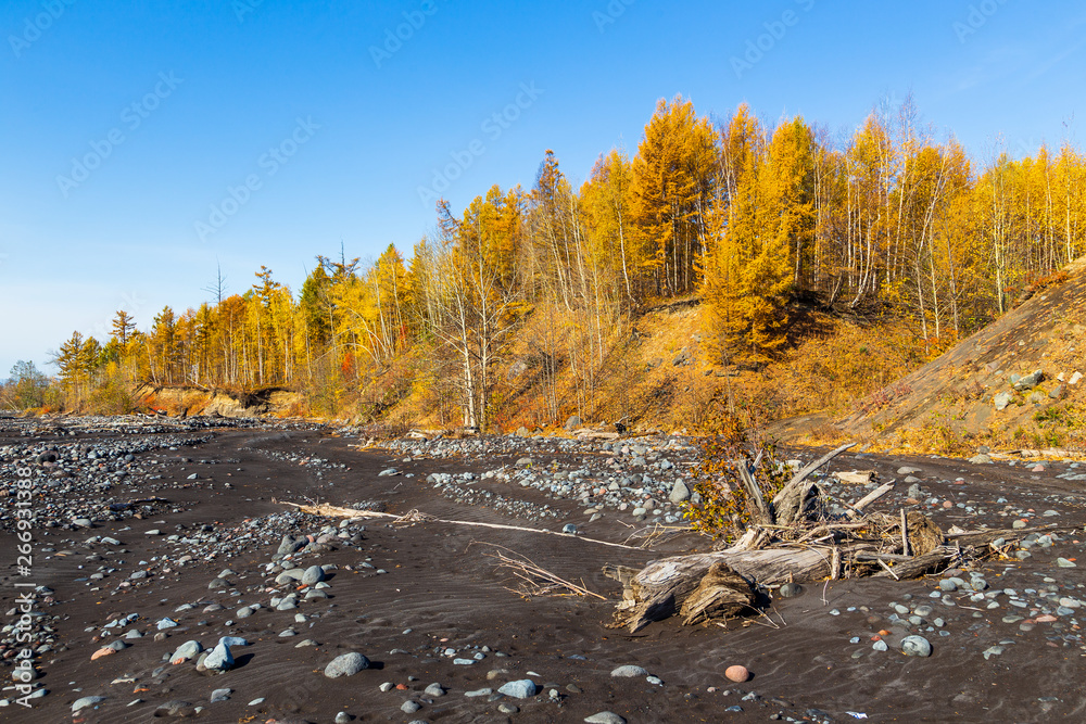 Volcanic area Mount Ostry Tolbachik, black sand, broken trees and stones, Kamchatka, Russia.