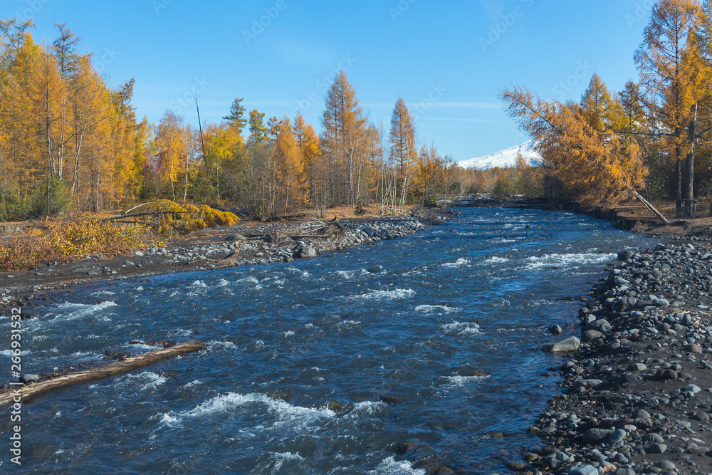 Log of wood in a rushing Studenaya River. Volcanic area Mount Ostry Tolbachik, Kamchatka, Russia.