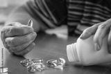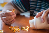 Senior woman taking omega 3 capsule from bottle. Medical concept