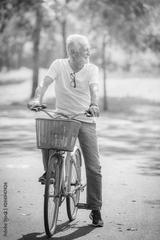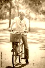 Old Man Riding on Bicycle in garden at sunset. Healthcare Concept. Relaxing in Park.