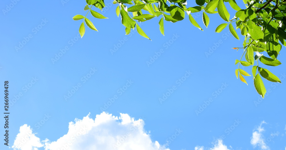 Blätter des Walnussbaumes im Sonnenlicht vor blauen Himmel und weißen Wolken