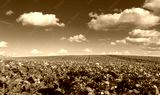 Landskape, beautiful potato field and sky. Green field blooming potato at beautiful day.