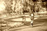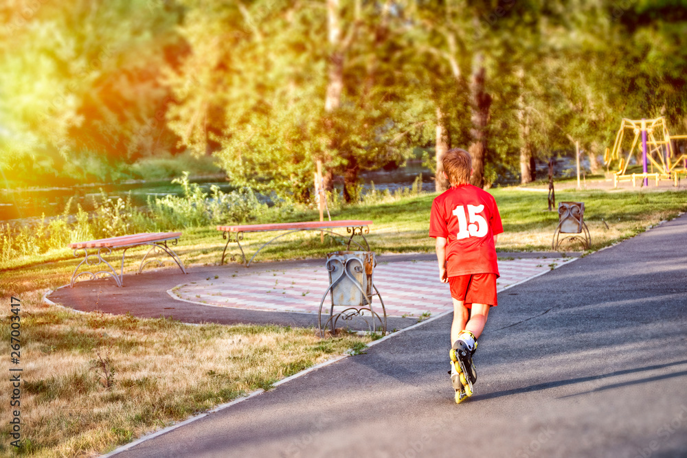 Running boy in park on summer autumn morning