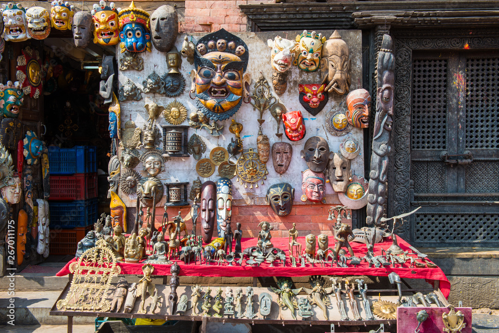 Wooden masks and handicrafts on sale at shop in the Thamel market, Thamel District of Kathmandu, Nepal.