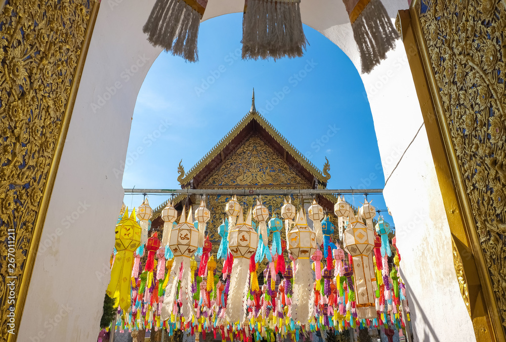 The entrance gate to Wat Phra That Hariphunchai, Lamphun province of Thailand during Yi peng (or Yee peng) festival.