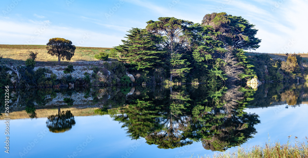 Trees reflecting in calm river water - panoramic landscape