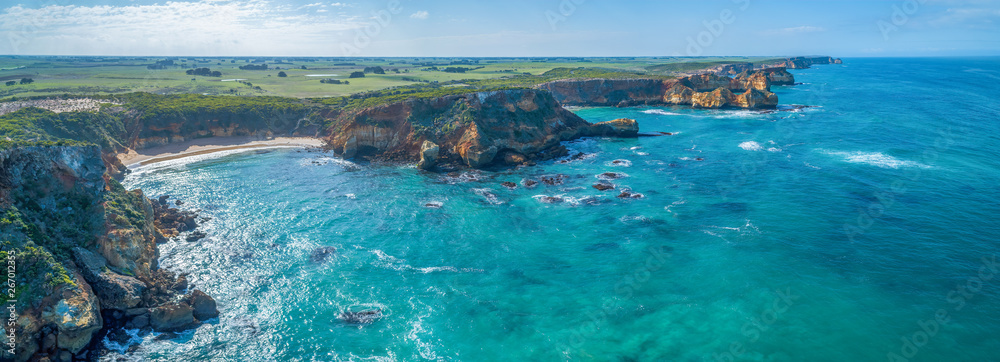 Wide aerial panorama of Childers Cove ocean coastline on Great Ocean Road, Australia