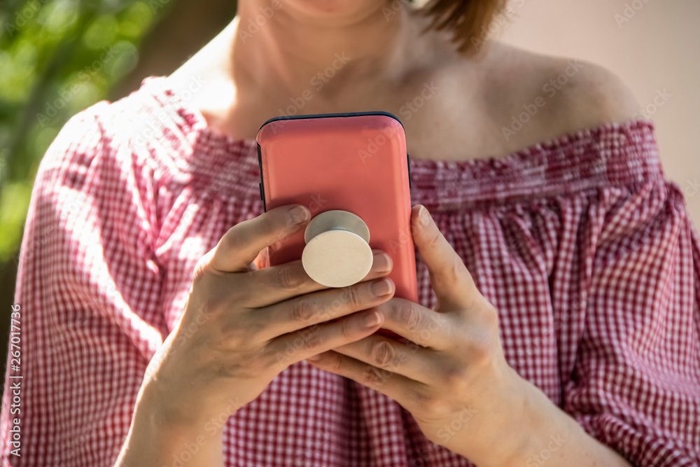 Close-up of woman holding and reading from a cell phone in pink case with grip handle on back - off shoulder blouse and short hair - selective focus and unrecognizable