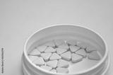 Pink triangular unusual pills in a white round box on yellow background with copyspace, side view