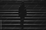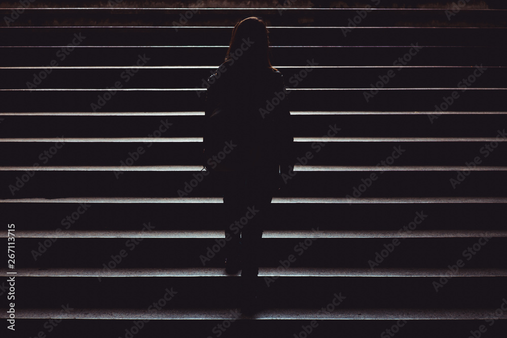 Black silhouette of a young woman casually dressed climbing up the city street stairs – Single person walking in the dark of the night – Concept image for leadership, achievement or independence
