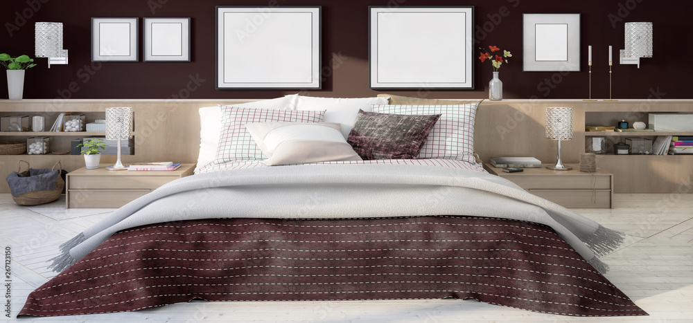 Elegant bedroom interior with template frames (panoramic) - 3d illustration