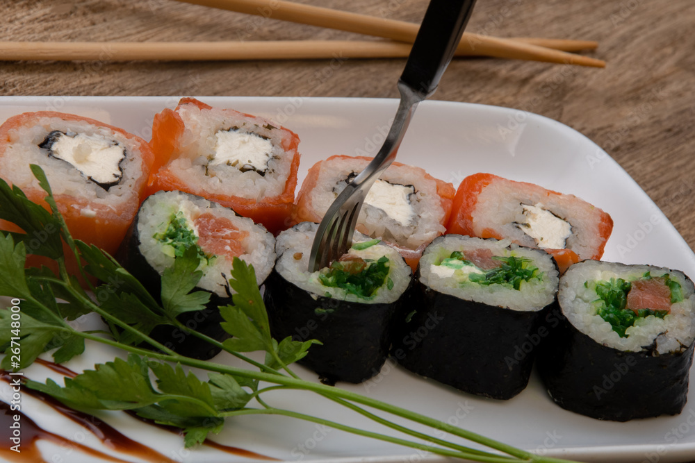 Sushi strung with a fork, Japanese rolls, fish and rice,