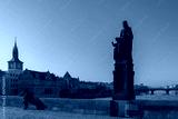 Outdoor sunny man tourist stand and relax beside balustrades near Statue of Saint Joseph at Charles Bridge, and background of Vltava river and Legions Bridge in Prague, Czech Republic.