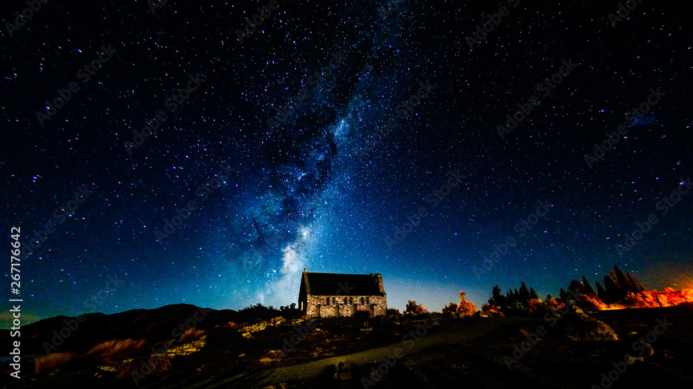 Backgrounds night sky with stars and milky way over the church at tekapo lake south island new zealand