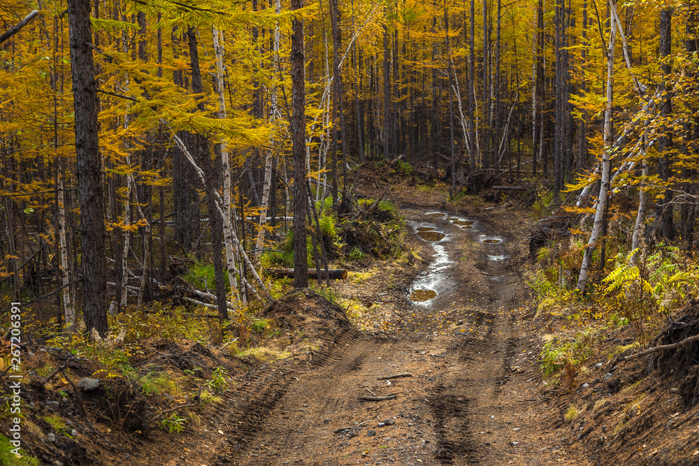 Forest duct with puddles, Milkovsky Districkt, Kamchatka, Russia.