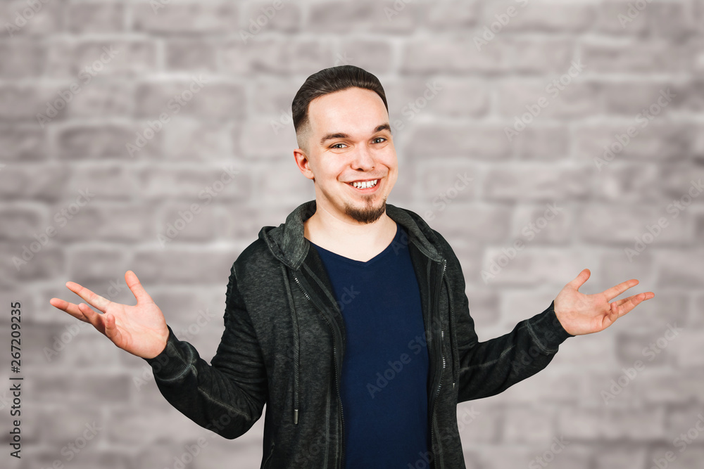 Confused young bearded man shrugs and smile, on brick wall background