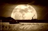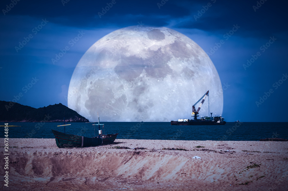Photo Manipulation. Fishing boat parked on beach and cargo ship anchored in the sea.