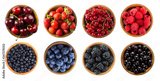 Berries and fruits isolated on white background. Raspberries, strawberries, currants, cherries, blueberries, bilberries and blackberries. Top view.