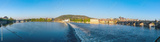 Outdoor sunny panoramic scenery of Vltava river with riverside, weir on the river, famous Charles bridge, and city skyline with background of Praha Castle on the hill in Prague, Czech Republic.