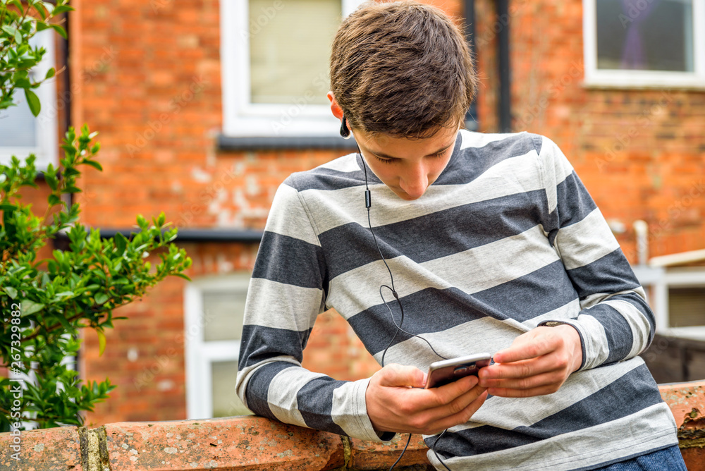 teen boy with smart phone listening or talking while sitting in british backyard garden. teenager and social media concept
