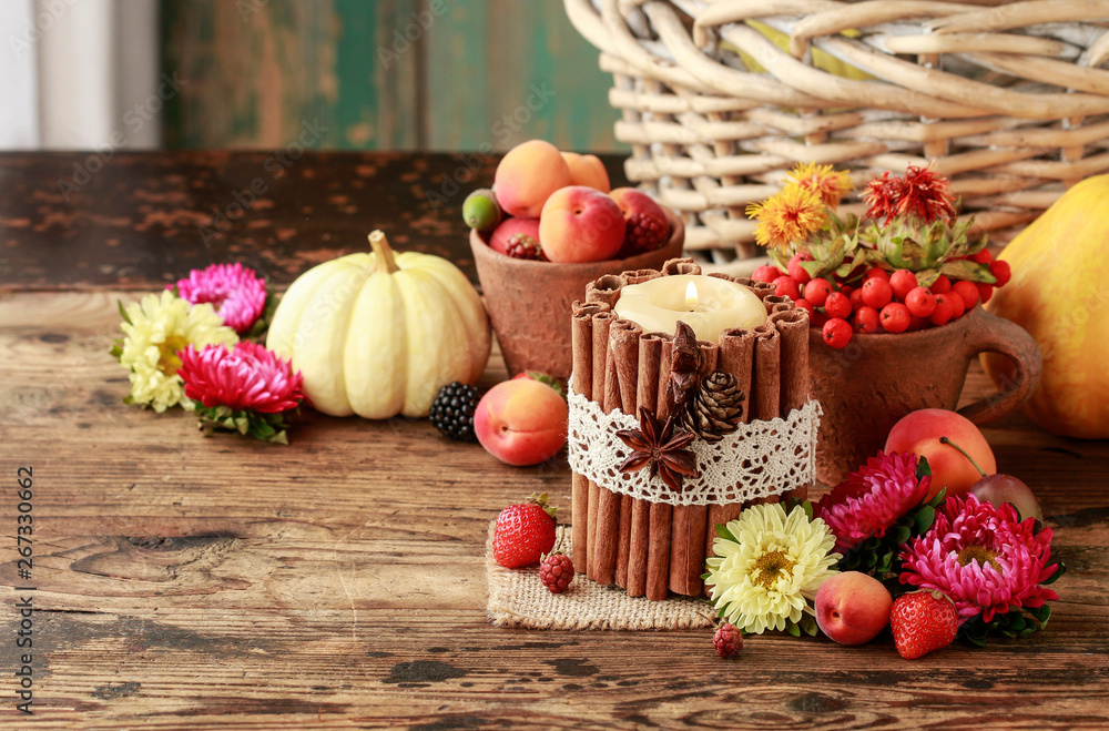 Candle decorated with cinnamon sticks among autumn fruits and flowers.
