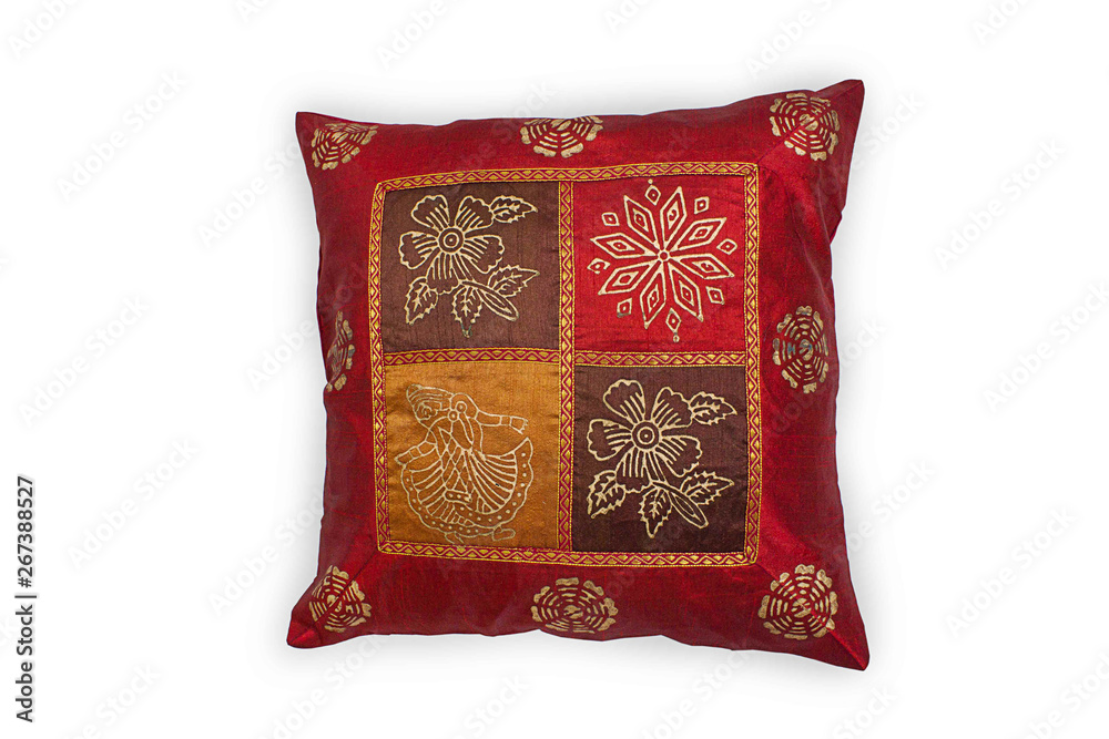 Maroon color ethnic cushion with beautiful floral pattern isolated on white background