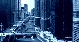 Chicago River with boats and traffic from above in the morning