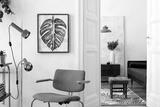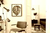 Stylish compositon of retro home interior with mock up poster frame, vintage orange chair, velvet sofa, design lamps, gold shelf, plants and elegant accessories. Nice home decor of living rooms.