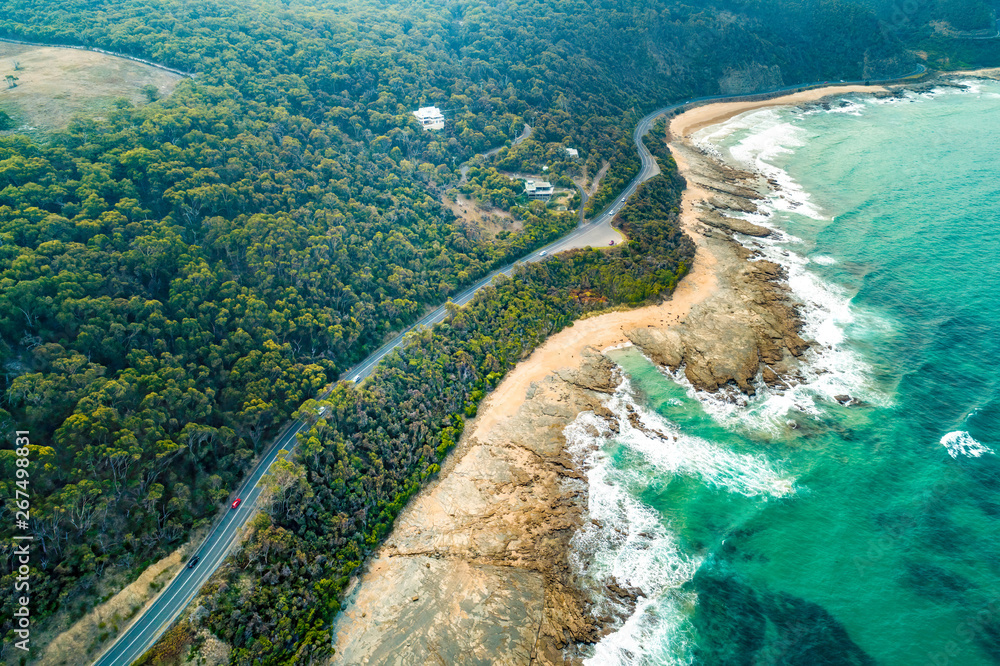 Aerial view of vehicles driving on Great Ocean Road along scenic coastline near Lorne, Australia