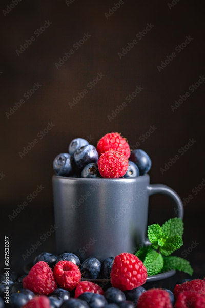 Raspberries and blueberries in a Cup on a dark background. Summer and healthy food concept. Background with copy space. Selective focus. Vertical.