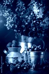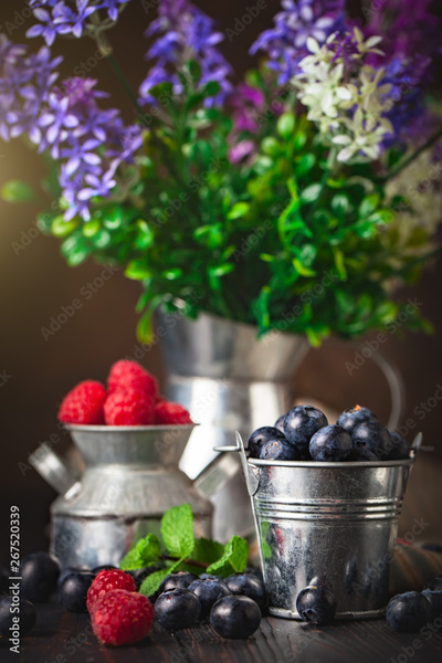 Raspberries and blueberries in a Cup on a dark background. Summer and healthy food concept. Background with copy space. Selective focus. Vertical.