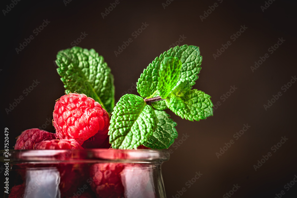 Raspberry. Raspberries and blueberries in a Cup on a dark background. Summer and healthy food concept. Background with copy space. Selective focus.