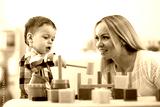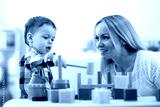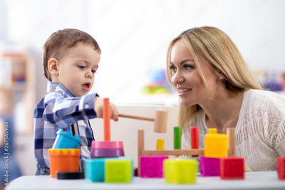 Nursery baby and mother or teacher play with montessori toys at table in daycare centre