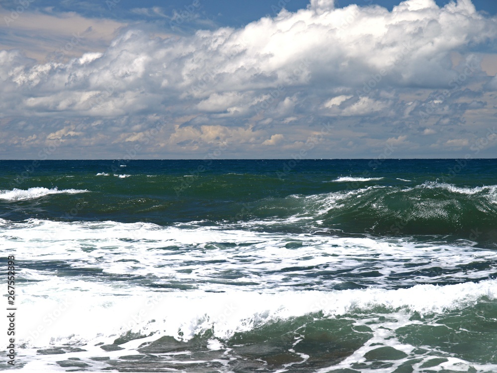 The peninsula of Crimea and Black sea. Emerald and pearl color of Black sea waves. The wild coast on the raging Black sea in the area of Chersonesos cape