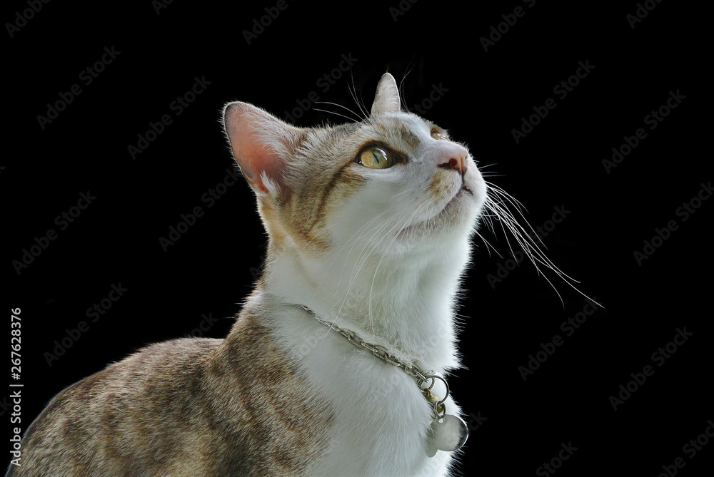 Close-up Domestic Cat Curiously Looking Upward Isolated on Black Background