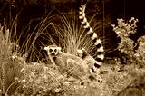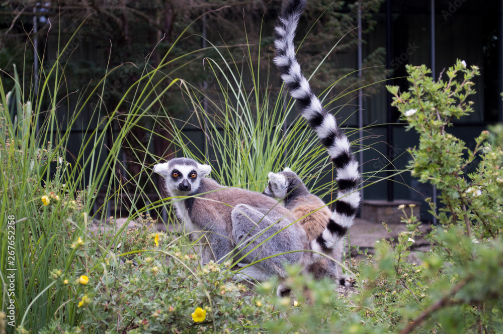 Lemur Catta between summer flowers. Lemur. Lemurs in the zoo. Zoo animals. Lemur in the grass. Lemur Catta