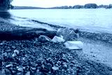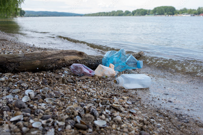 Plastic bags and bottles on the river coast as concept for water pollution