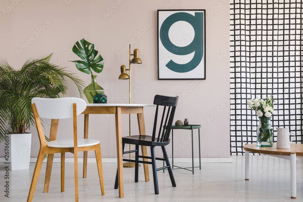 Modern poster on pastel pink wall of elegant living room interior with round wooden table with chairs