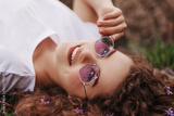 Young beautiful happy smiling lay wearing stylish purple sunglasses, lying on the meadow with violets.