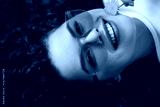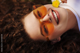 Outdoor flat lay, top view close up portrait of young beautiful happy smiling curly woman wearing stylish orange sunglasses, model lying on the green grass, holding dandelion