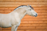 Portrait of Norwegian fjord horse close up. Profile side view.