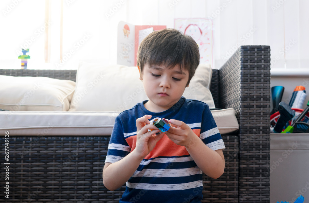 Portrait of Kid boy playing with construction plastic toy blocks in playroom, Child relaxing and playing at home in bright sunny day the summer.