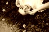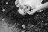 Outdoor flat lay, top view close up portrait of young beautiful happy smiling woman with long curly hair, wearing stylish yellow sunglasses, lying on the meadow with dandelions. Copy, empty space