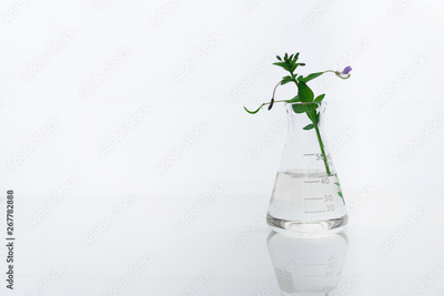 glass flask with wild flower for medical health or cosmetic science research laboratory white background