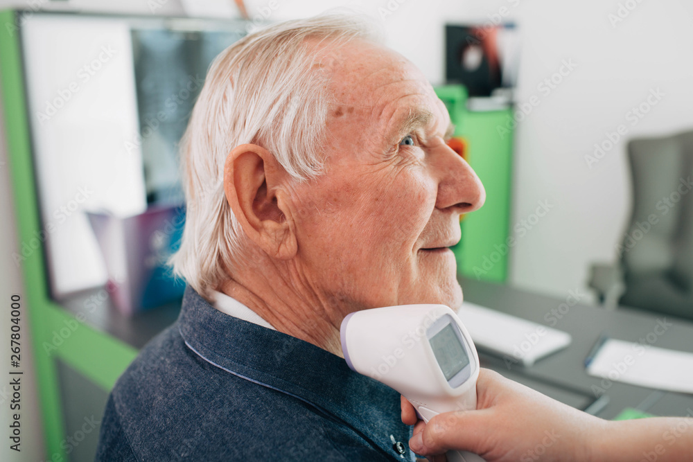 Nurse taking a senior patient's temperature with a digital thermometer.