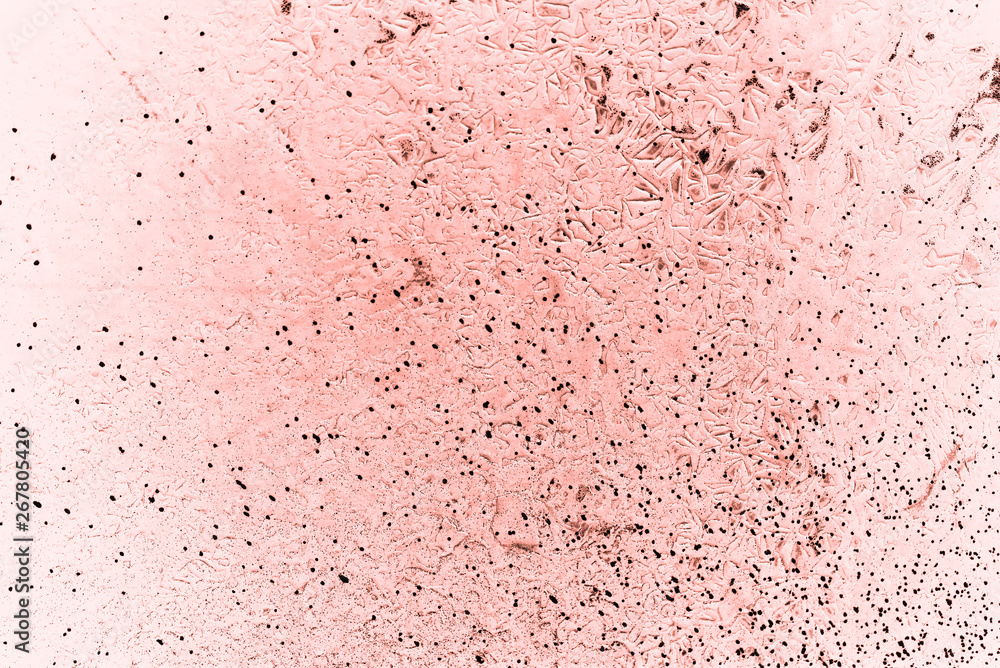 Vintage pink background. Rough painted wall of living coral color. Imperfect plane of beige colored. Uneven old decorative toned backdrop of beige tint. Texture of pink hue. Ornamental stony surface.