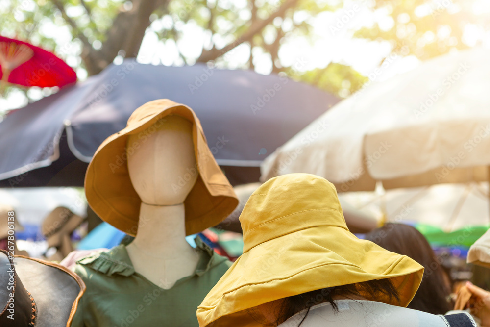Design fabric hat at the outdoor shop over blurred tree, outdoor day light, fashion and beauty