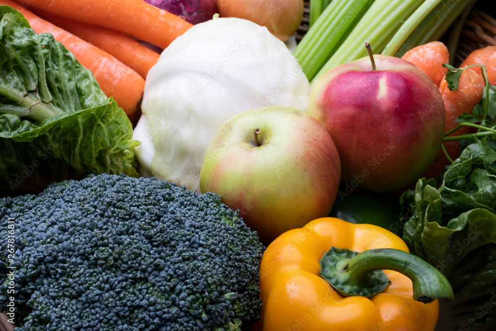 Colorful vegetables and fruits, broccoli, peppers, apples, carrots, onions. Healthy diet